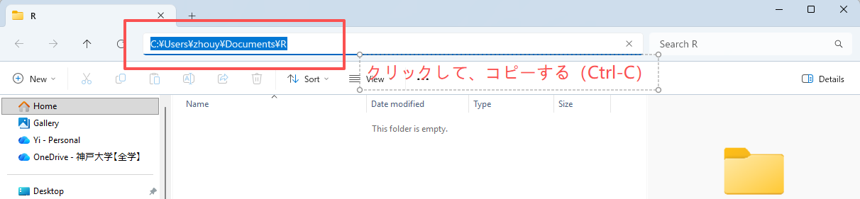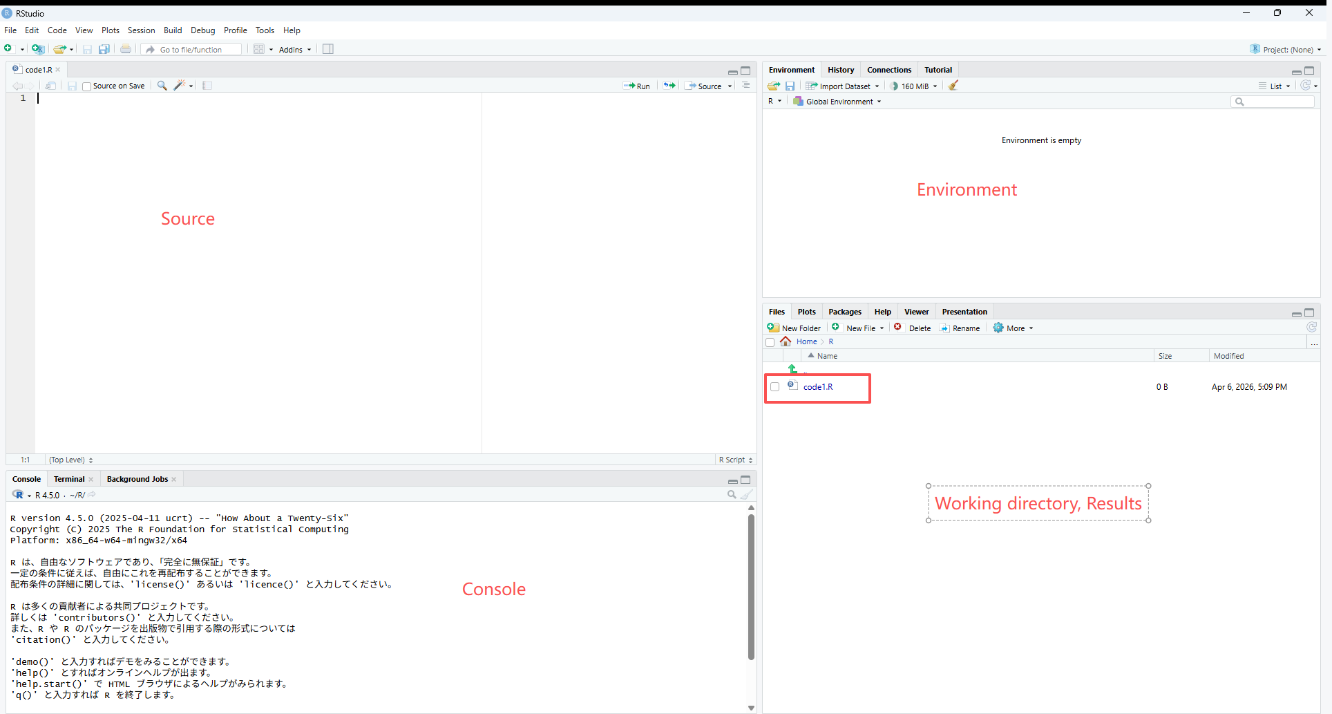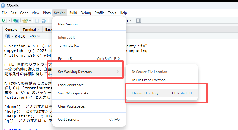 2.1.2 RStudioを起動し、作業ディレクトリ(パス、path)をRに設定しま。