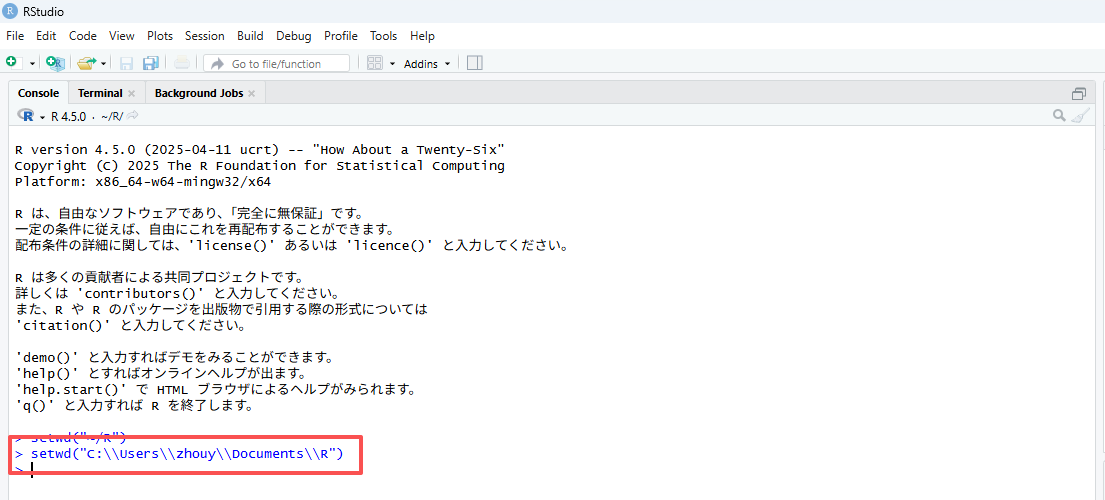 setwd("C:\\Users\\xxx\\Documents\\R")ありますいはsetwd("C:/Users/xxx/Documents/R")を入力します