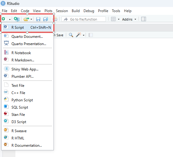 Fileの下のボタンをクリックし、R Scriptをクリックします。Untitled1というファイルが作成されます。