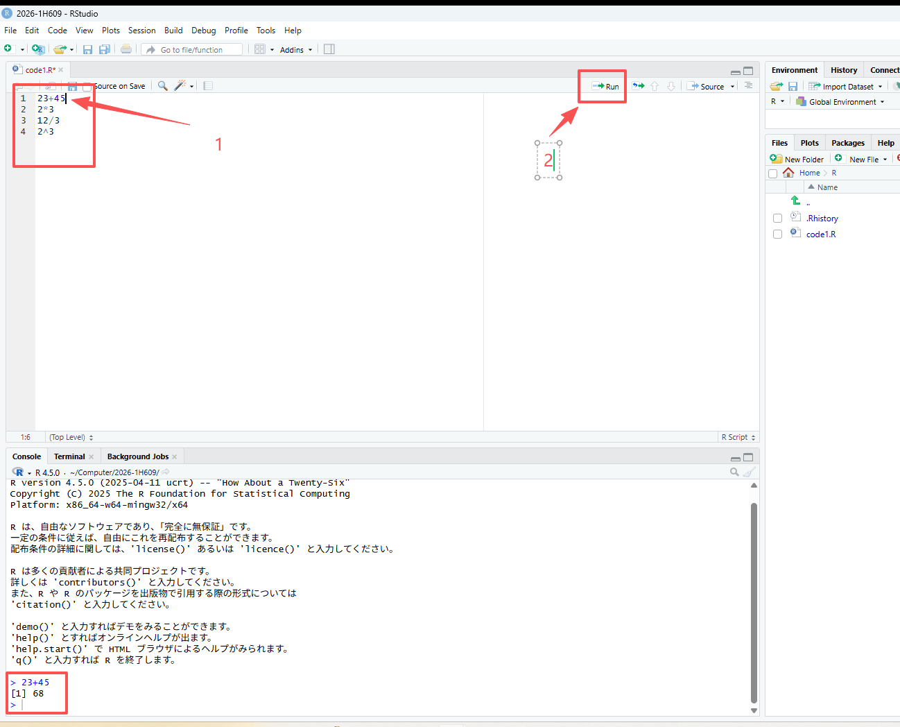 スクリプトにコードを入力し、その行にカーソルを置いて実行(Run)をクリックすると、結果が出力されます。